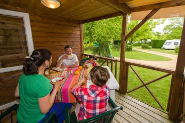 Holzverkleidetes Mobilhome mit integrierter Terrasse, die bei jedem Wetter zum gemütlichen Draußensitzen einlädt. Auch die moderne Inneneinrichtung wird alle, die ihren Urlaub am liebsten in einer natürlichen und doch zeitgemäßen Umgebung verbringen, mit ihrem Charme bezaubern.