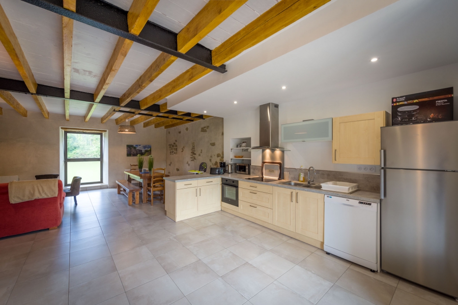 Evier, réfrigérateur/congélateur, four, lave-vaisselle, machine à laver le linge, cafetière, bouilloire, grille-pain, micro-onde, plaques à induction, hotte aspirante, placards, inventaire de cuisine complet, grande table en bois massif, chaises, chauffage électrique, TV, canapé.