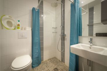Douche, lavabo, placard, WC séparés.